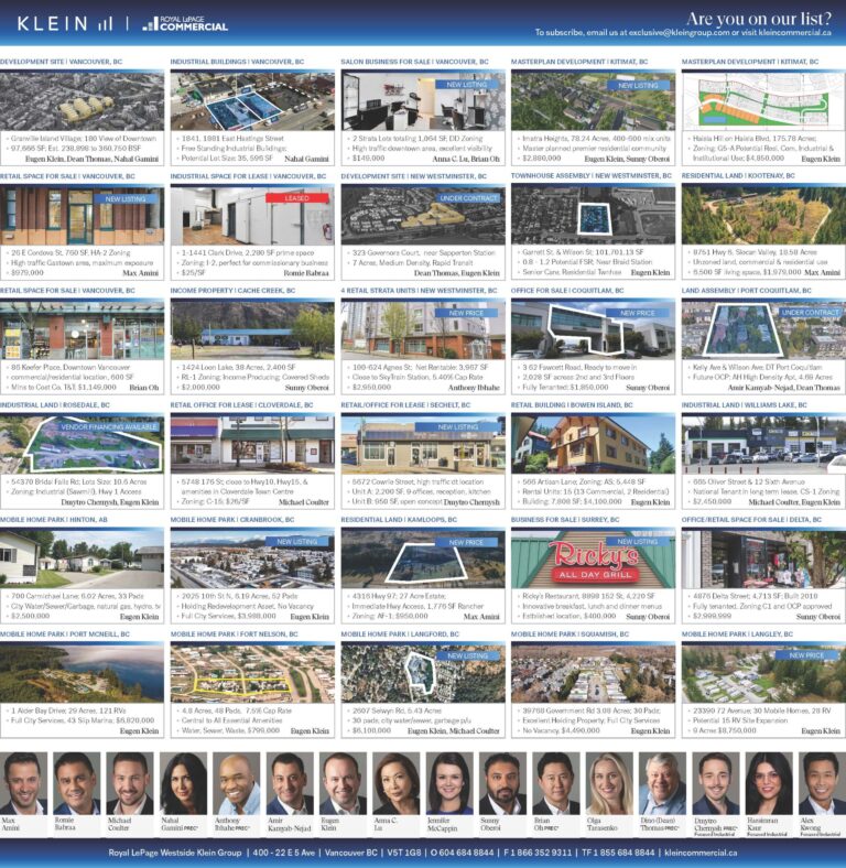 Explore Klein Group’s latest commercial real estate listings as published in the Western Investor's April 2024 issue. This dedicated page features our full-page ad showcasing investment opportunities across asset classes including land, retail, office, multifamily, mobile home parks, and more. We advertise regularly in trusted industry publications to maximize exposure and connect with serious investors across Vancouver and British Columbia.