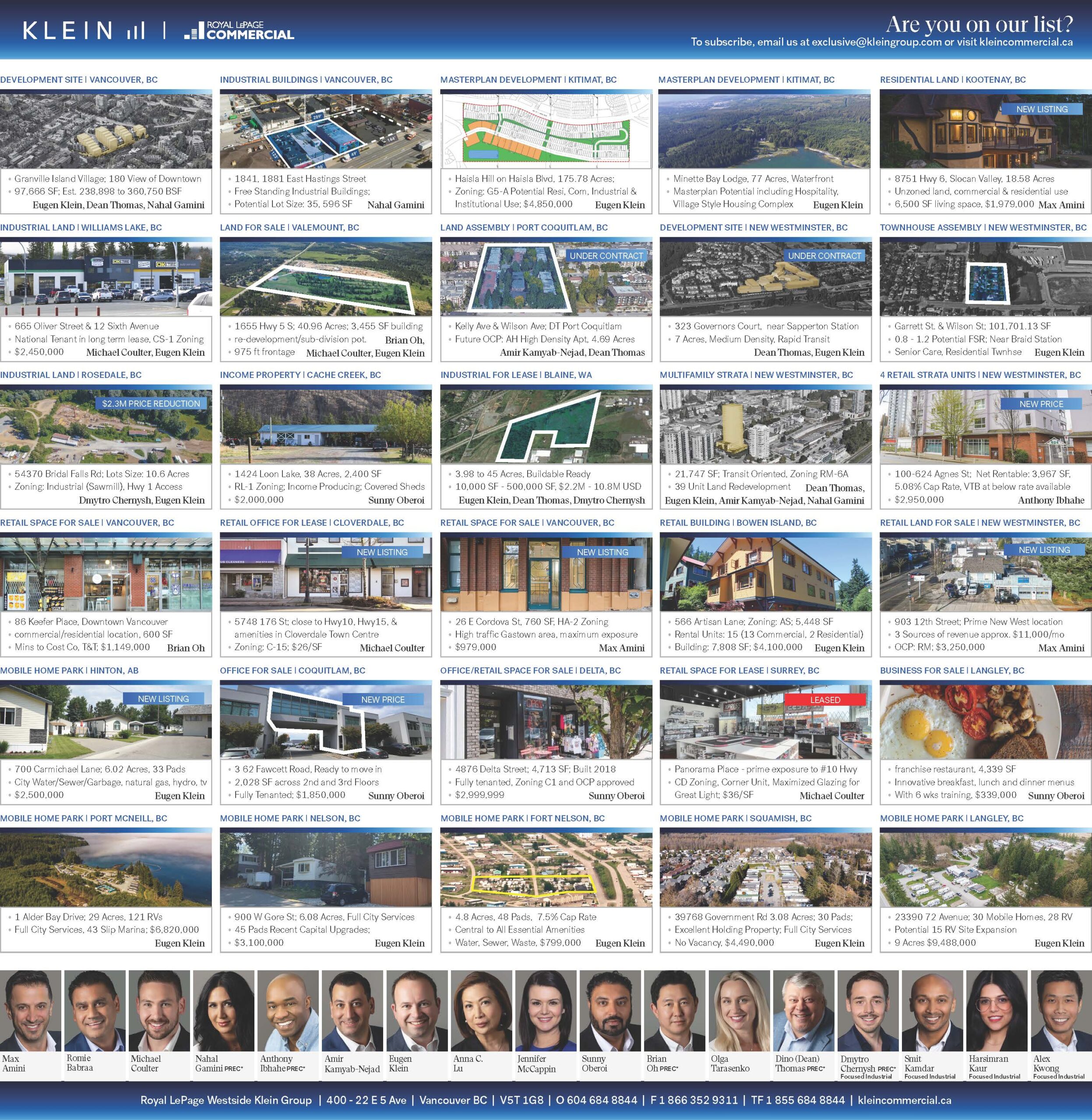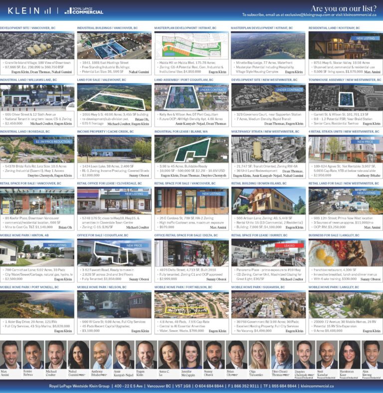 Explore Klein Group’s latest commercial real estate listings as published in the Western Investor's February 2024 issue. This dedicated page features our full-page ad showcasing investment opportunities across asset classes including land, retail, office, multifamily, mobile home parks, and more. We advertise regularly in trusted industry publications to maximize exposure and connect with serious investors across Vancouver and British Columbia.