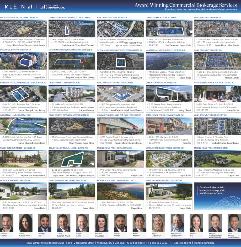 Explore Klein Group’s latest commercial real estate listings as published in the Western Investor's January 2024 issue. This dedicated page features our full-page ad showcasing investment opportunities across asset classes including land, retail, office, multifamily, mobile home parks, and more. We advertise regularly in trusted industry publications to maximize exposure and connect with serious investors across Vancouver and British Columbia.